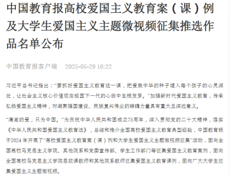 5月29日,延续近一年的“中国教育报2024年大学生爱国主义主题微视频征集活动”评选结果终于出炉。华亿在线体育马克思主义学院指导推荐报送的《铭记历史传承精神——抗美援朝的时代回响》和《红色足迹:与老战士共探革命之路》两部学生微视频作品被中国教育报评选为优秀作品。近期,两部作品将在中国教育报相关平台进行展播。