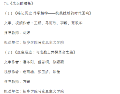 接到通知后,马克思主义学院高度重视,汪如磊院长和沈田青副院长精心筹划并全程把关。从参赛选手选拔、参赛主题选择、作品推敲打磨到作品上报审核等各个环节,对作品的“内容层”和“技术层”精心指导打磨。马院在本次评选活动中共上报作品10部,最终有2部作品成功入围。马克思主义学院刘婷老师指导的作品《铭记历史传承精神——抗美援朝的时代回响》被评选为优秀作品,该作品以抗美援朝这一具有重大历史意义的事件为切入点,通过对当代大学生和抗美援朝老兵的深入采访,倾听他们对国家历史的认知与感受,旨在通过两代人的对话与回忆,唤起青年一代对国家重大历史事件的深刻记忆与崇高敬意。马克思主义学院方耀老师指导的作品《红色足迹:与老战士共探革命之路》被评选为优秀作品,该部作品以当代大学生和一名老战士共同参观许昌革命烈士纪念馆为主题,通过老战士的讲述,一起回顾了许昌地区的革命历程,提醒我们铭记英雄的付出,激发我们为实现中华民族伟大复兴的信心和决心。