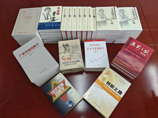 此次捐赠的书籍包括《李成勋学案》(共四编60本,每编15本)《〈资本论〉基本原理求索》(10本)《经济发展战略学》(共6本,新老版本各3本)《产业发展战略学》(10本)《1996~2050年中国经济社会发展战略——走向现代化的构想》(2本)《新乡创新之路》(2本)《安彩之路》(10本),共计100本,每本赠书均有李成勋教授亲笔赠言及私人印章。