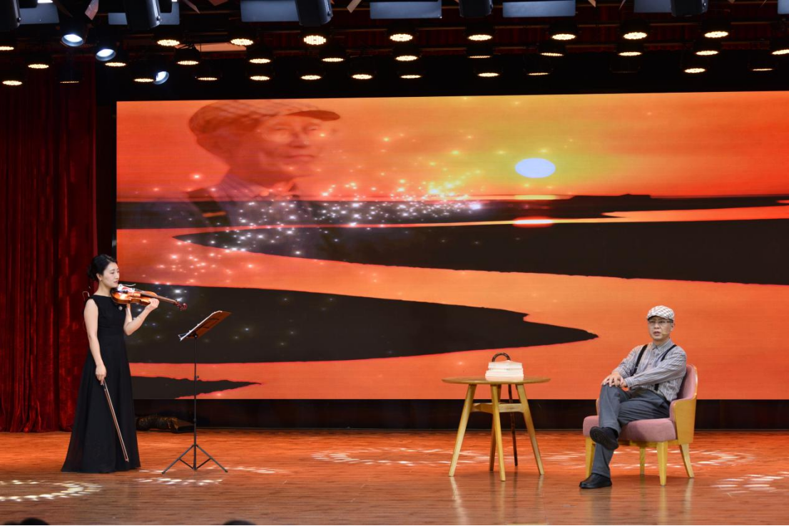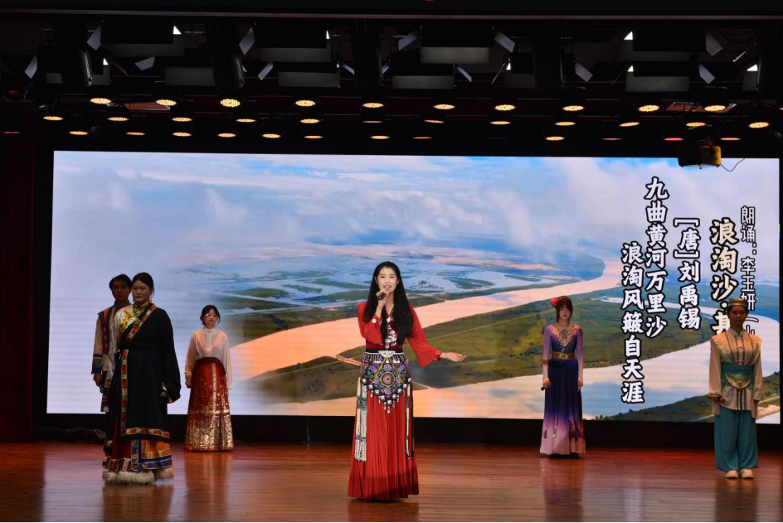 诗会以“黄”“红”“绿”三种颜色为基调,以诗歌朗诵、歌舞表演、情景再现等多元艺术形式,全方位展现黄河文化的深厚底蕴与时代价值。在雄壮激昂的“天地之河”舞蹈中,诗会拉开了序幕。第一篇章“黄河之魂——大河诗韵”的色调为黄色,代表中华优秀传统文化,来自黄河流域九省的师生代表朗诵了《诗经》《使至塞上》等古典诗词。第二篇章“黄河之光——民族脊梁”色调为红色,代表革命文化,姚喜双充满深情地朗诵了《沁园春·长沙》,教师代表用豫剧戏歌的形式创新演唱《沁园春·雪》,彰显了胸怀天下、志存高远的革命抱负,以及以天下为己任、改造旧世界的担当精神。第三篇章“黄河之兴——时代强音”的色调为绿色,代表社会主义先进文化,于同云、李莎倾情演绎了《念奴娇·追思焦裕禄》、《郑州黄河湿地》,反映了执政为民的宗旨意识和在实践中践行生态文明思想,体现了新时代的治国理政理念;教师代表用情景诵读的形式创新朗诵了台湾诗人余光中的《黄河》,彰显了深沉厚重的家国情怀与民族文化认同,反映了漂泊游子对民族根脉的眷恋与追寻。随着首届校友、著名女高音歌唱家赵云卿与在校大学生联袂合唱《珊瑚颂》,诗会的氛围被推向了高潮。