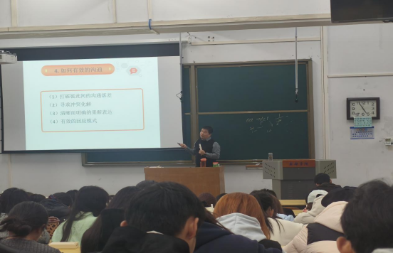 讲座伊始,于洪超以“沟通不畅引发的校园常见矛盾”为切入点,结合大学生在宿舍相处、团队协作、师生交流中的典型案例,生动阐释了有效沟通对构建和谐校园关系、促进个人心理成长的重要意义,瞬间引发在场学生的强烈共鸣。他提到,经济类专业学生未来将面临职场谈判、客户对接等高频沟通场景,当下培养沟通能力既是校园生活的需求,更是职业发展的基础。