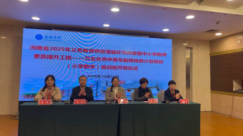 10月30日下午,由我校中小学教师校长研修院统筹承办、数学与统计学院组织实施的“河南省2025年义务教育师资薄弱环节改善暨中小学教师素质提升工程——万名优秀中青年教师培育项目(小学数学)研修班”,在新乡宾馆会议室举行开班仪式。数学与统计学院党委书记毛群英、中小学教师校长研修院副院长宋华、项目管理团队核心成员,以及来自郑州、洛阳、三门峡三市的98名小学数学骨干教师齐聚一堂,共同开启本次研修征程。数学与统计学院副院长皮磊主持开班仪式。