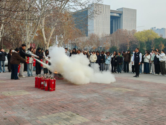 理论学习结束后,全体参训学生移步至博雅广场,开展灭火器使用实操演练。在专业老师的指导下,学生们进行了灭火器实操体验,切实掌握了初期火灾的扑救技能。