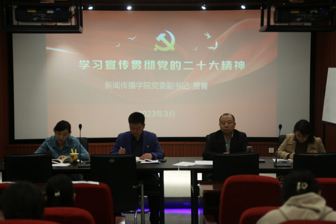 为深入学习宣传贯彻党的二十大精神,组织好党的二十大精神宣讲活动。3月7日下午,新闻传播学院在A12号教学楼五楼审片室召开党的二十大精神宣讲会,党委副书记贾菁作题为《实施科教兴国战略,强化现代化建设人才支撑》的宣讲报告,新闻传播学院全体教师参加了会议,会议由党委书记王卫锋主持。