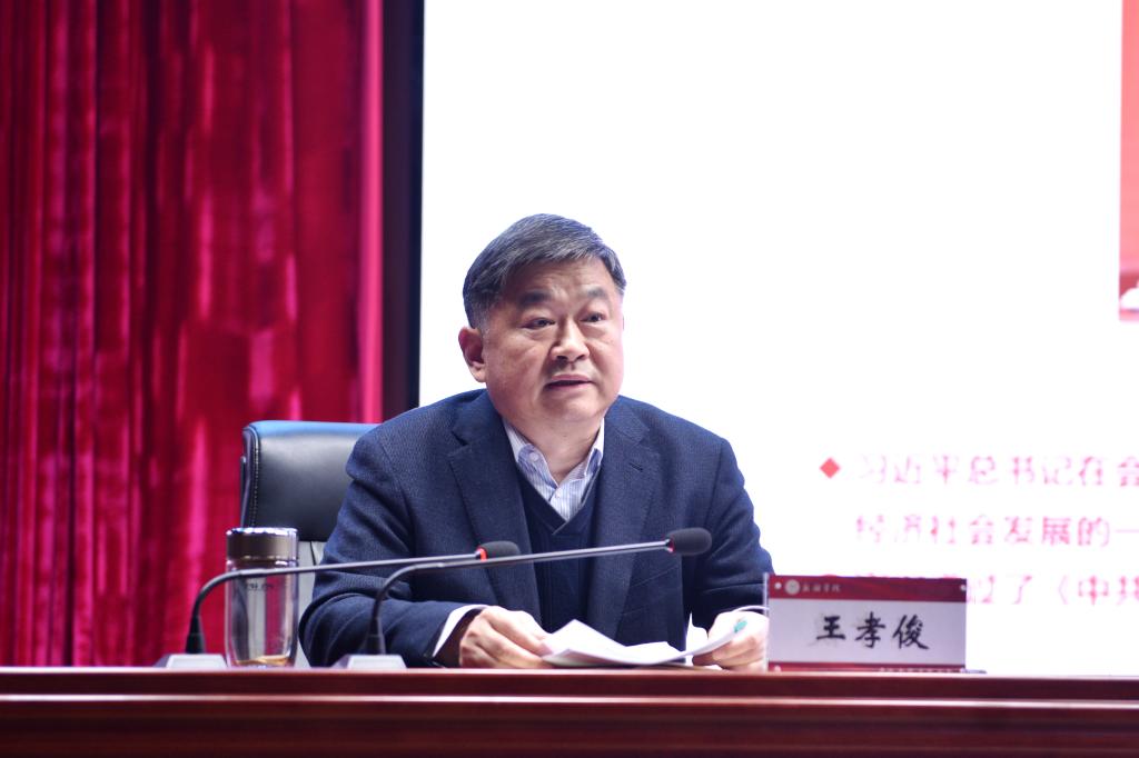 王孝俊以“深入学习贯彻党的二十届四中全会精神 奋力谱写我校高质量发展新篇章”为题,围绕“提高政治站位,深入学习领会党的二十届四中全会精神”“坚持学深悟透,全面把握‘十五五’规划要点及关于教育改革发展的部署要求”“坚定发展信心,切实推动全会精神在我校落地生根、开花结果”三个方面,紧密结合省委十一届十次全会部署要求和学校实际情况,对党的二十届四中全会精神进行了深入系统解读,对我校学习贯彻工作提出明确要求。